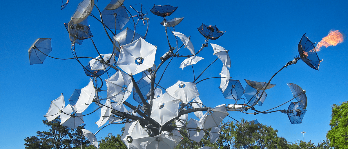 Brollyflock by Flux Foundation was designed and built for the Electric Daisy Carnival in Las Vegas, NV, and travelled to further events in California. A 40-foot high bouquet of umbrellas stemming from three enormous umbrella handles, the installation featured misting water effects, interactive and ambient flame effects, and an LED system. Built from steel pipe, stainless steel sheet, and fabric, Brollyflock entertained, inspired, and refreshed event participants near and far, around the clock. Initial design by Rebecca Anders, with input from Don Cain (systems design), Marianne Ortega (brolly design and development), and many others within Flux. Built with a dedicated crew of skilled and creative artists. More about Flux Foundation.