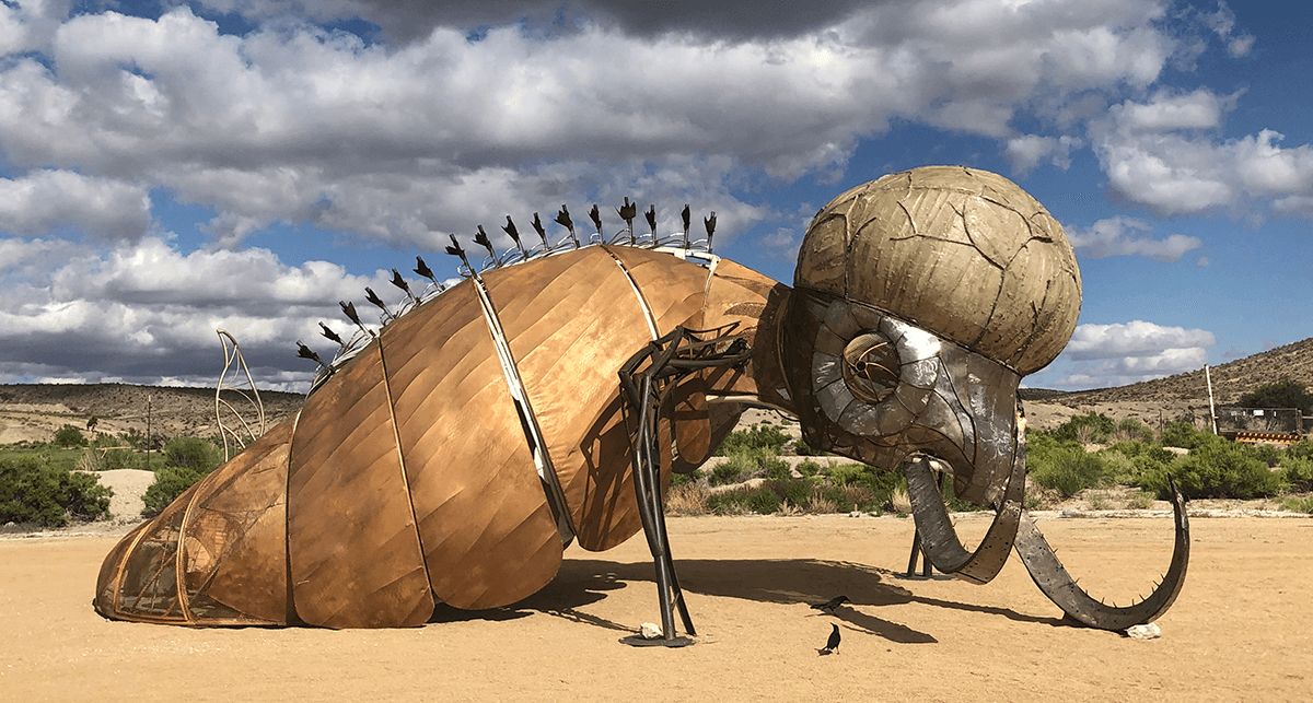 FishBug (Chimera Sententia) first emerged as a grant-funded installation at Burning Man 2009. Designed and directed in collaboration with Jessica Hobbs, FishBug is a 25-foot long, 15-foot high steel-structured interactive beast. Its kinetic sides flex deeply as jets of flame on its spine flare and fade, while projected video dances over its translucent scalp. Despite minor explosions shooting from its tusks, the softly woven interior encloses a cozy shelter in the belly of this evolving monster. Built with a 20+ strong crew of artists of many varied skills, the FishBug visited events across California and Nevada, before finding its forever home on the Spicer Ranch in Beatty, NV.