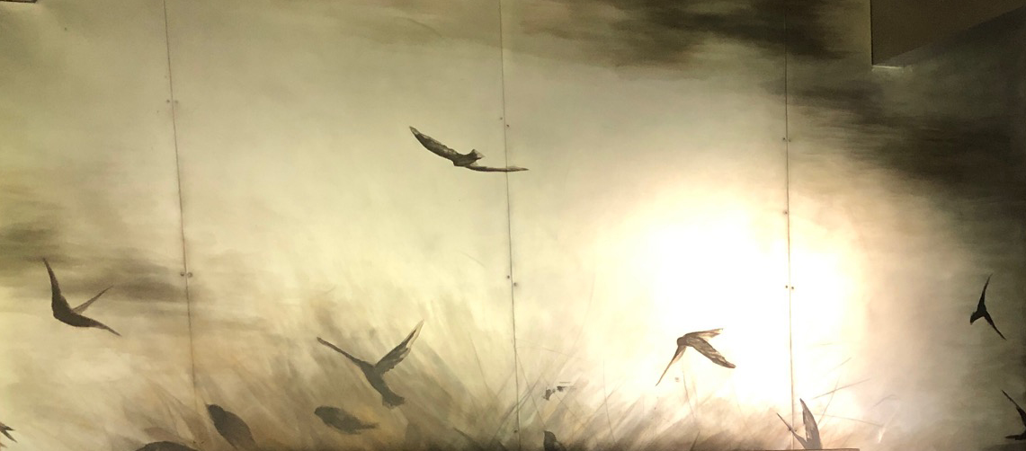 Comissioned and designed in 2019 for a house renovation in Pope Valley CA, the Flock Wall mural depicts starlings rising up from a flourish of vegetation, against a softly reflective background, which invites light into the room. The sheet steel surface was first sanded and textured to establish the image areas, then after their installation the color and detail of the birds and landscape were developed with several applications of patina and metal stain.