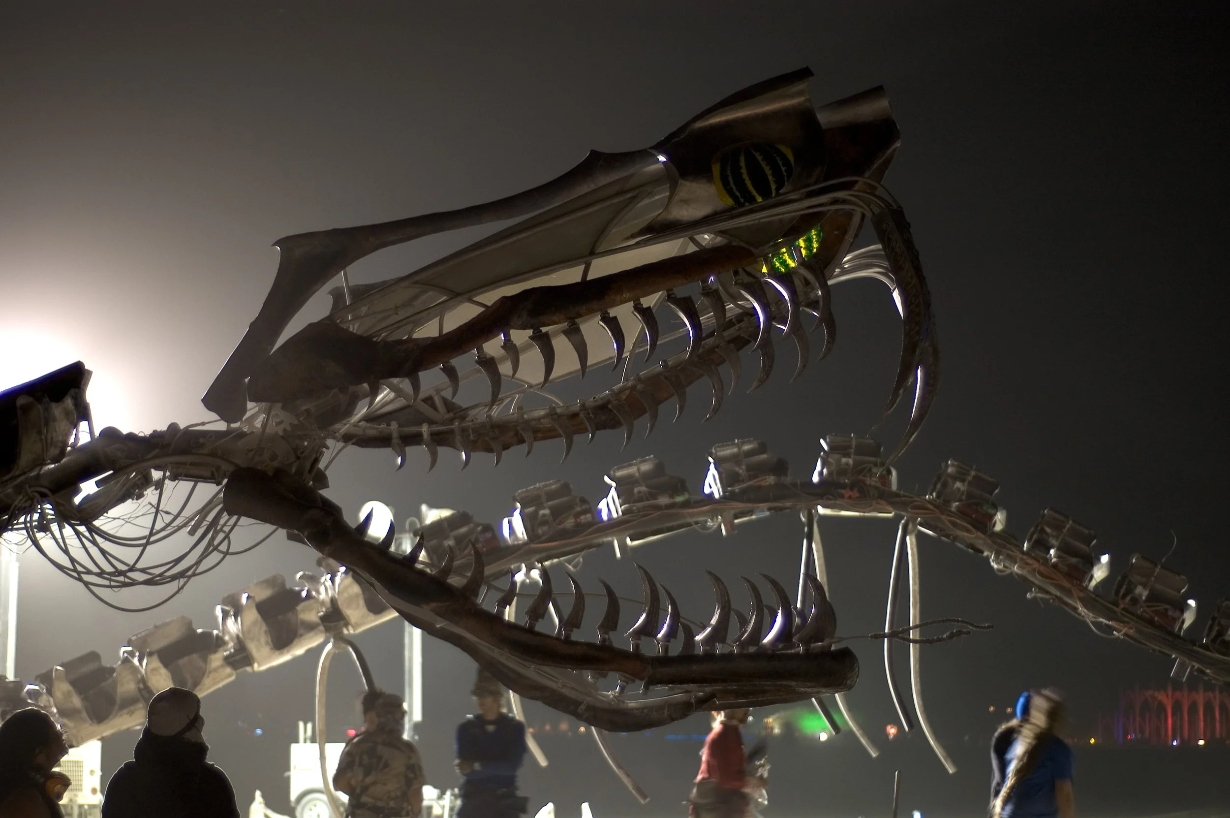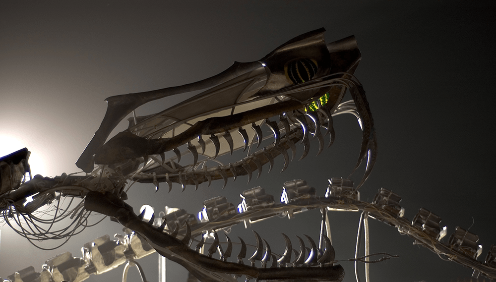 Serpent Mother (2006) by the Flaming Lotus Girls is an elevated, 168-foot long coiled skeletal snake with an articulated neck and head, featuring interactive fire along its stainless steel vertebrae and a central copper egg which opens to display fantastic liquid flame effects. The initial design was developed by Tasha Berg, with input from Charlie Gadeken and other members of the Flaming Lotus Girls. Yasi Mawaz-Kahn designed the Serpent Mother’s head, for which I provided technical design and led its fabrication. John DeVenezia, Caroline Miller, and Rosa Anna Defillipis designed its many flame effects, and Michael Prados developed its kinetics and engineering. The crew for this beloved installation included many more skilled and innovative artists and makers. More about Flaming Lotus Girls.