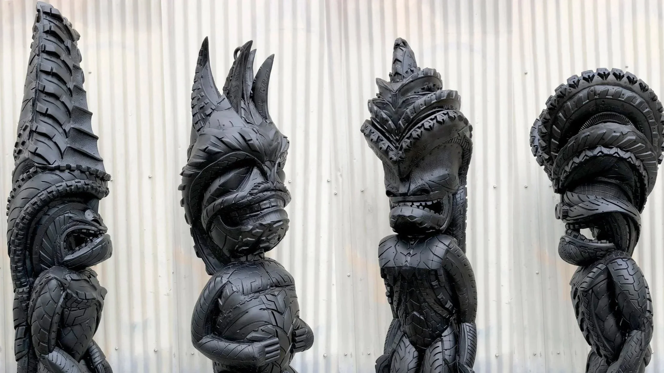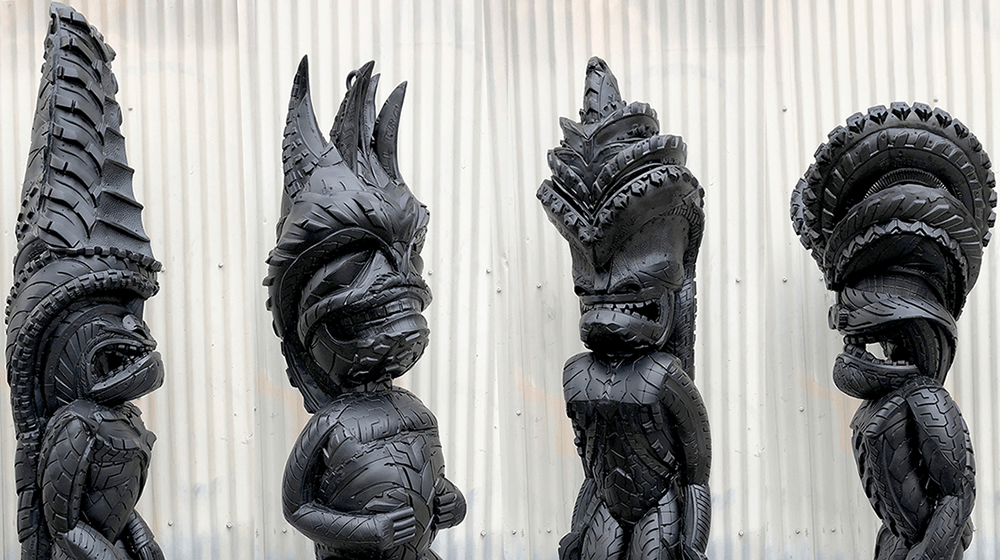 The Tire Tikis (2014 - 2018) are four larger-than-human sized tiki idols made from recycled motorcycle and ATV tire over powdercoated steel frames. Made to adorn Jason Anderholm’s Tiki Hut Hod Rod art car, the Guardian, the Messenger, Well-Being and Adventure were concepted, designed, and built for this larger project. Their forms are based on Hawaiian ki’i, and their style is directly inspired by 20th-century ‘tiki’ pop art.